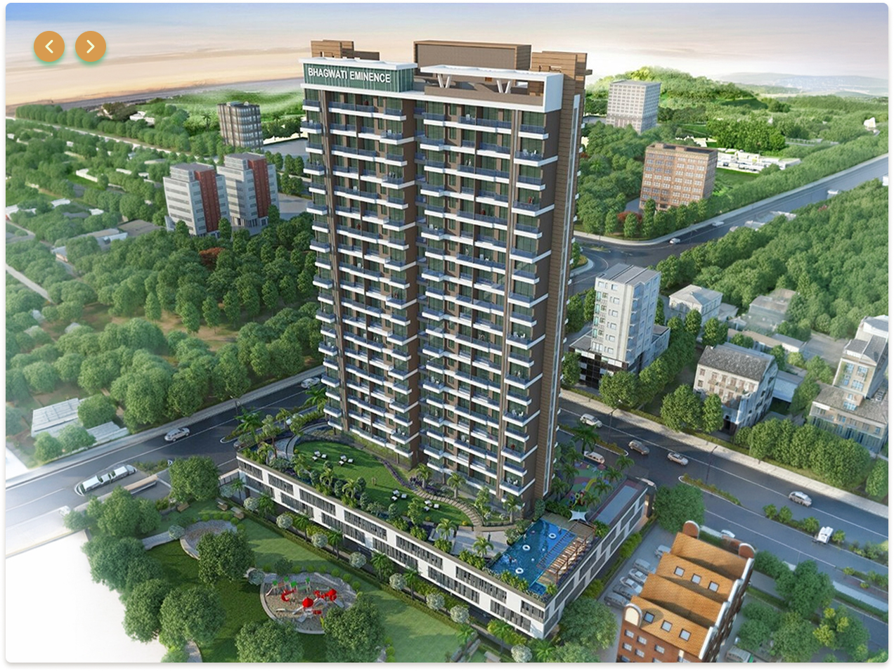 Spanning an impressive 2,15,000 sq.ft and rising gracefully to 70 meters, this distinguished GR + 2 podium + 20-storey residential landmark embodies refined metropolitan luxury. The façade presents a harmonious rhythm of articulated balconies, warm-toned cladding, and expansive glazed panels, crafting a sophisticated interplay of texture, light, and shadow. Its elegantly defined crown enhances the skyline presence, lending the structure a poised architectural identity.